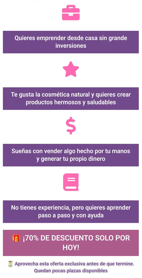 Con nuestro E-book + 30 clases en video aprenderás paso a paso a crear mantequillas corporales en tendencia y comenzar a generar ingresos desde casa en un menos de una semana, sin experiencia ni grandes inversiones.